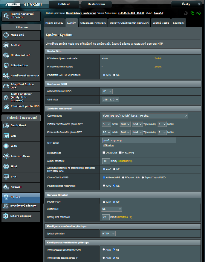 Správa - opět široké možnosti nastavení. Změna přihlašovacího jména a hesla a navíc možnost CAPTCHA kódu, což se hodí, pokud jste si povolili správu přes WAN. Další novinkou (aspoň pro mě) je možnost nastavení hibernace připojeného HDD - to když si k routeru připojíte pevný disk. Je zde i plánovač restartování, nastavení tlačítka WPS, zabezpečený způsob přihlášení - https.A povolíte-li SSH, můžete si s operačním systémem routeru "povídat" přes příkazovou řádku.