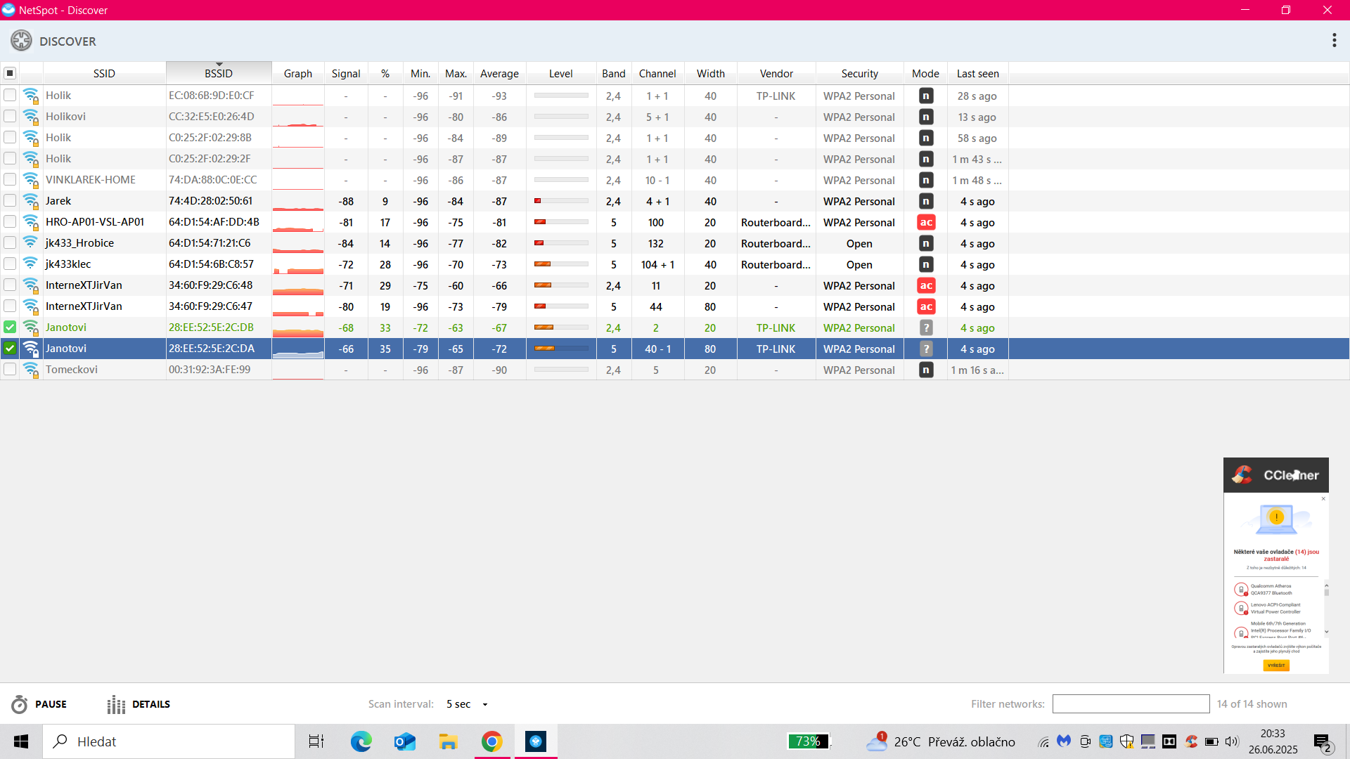 No něco jsem zkusil, ale nevím moc se v tom nevyznám, raději vám nahraju fotku. Moje sítě jsou Janotovi. Připadá, že jsem asi na správném channelu, akorát nechápu u té druhé sítě 40 - 1.