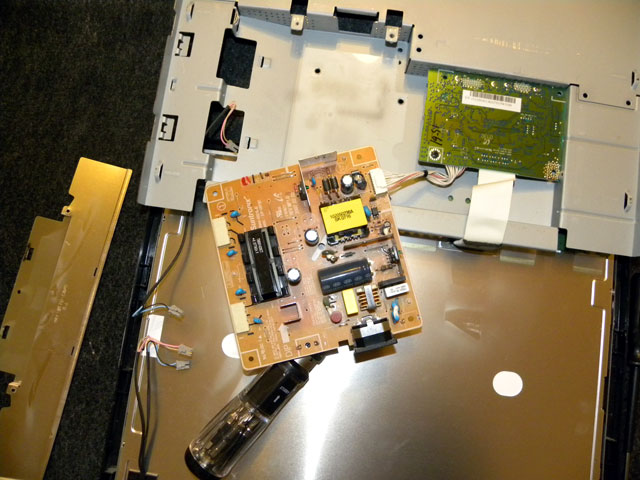 Závada přišla nečekaně a to tak, že monitor zhasnul. LED indikující funkci však svítila. Žádná zpráva o zmizení signálu. Nefungovalo ani OSD menu. Po vypnutí a zapnutí monitor naskočil, ale po několika vteřinách obraz zase zmizel. Choval se stejně při DVI i VGA vstupu. To mě vedlo k tomu, že lektronika bude zjevně v pořádku a závadu jsem odhadl na zdroj, resp. část, která vyrábí napětí pro podsvětlovací CCFL trubice.