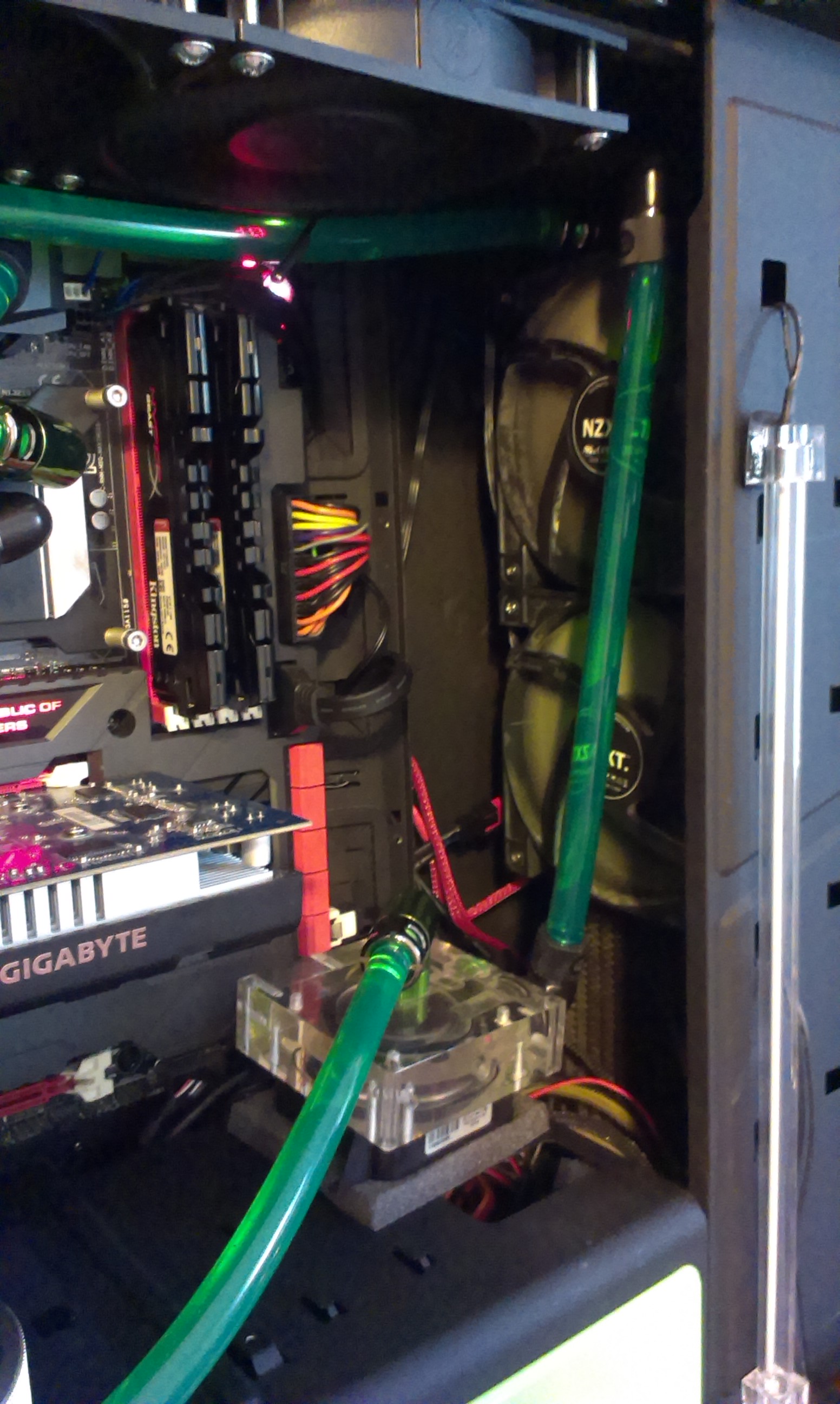 Přidán přední 360mm radiátor, na něm 3x EK Vardar a za ním na pull 2 původní 120ky (zatím).