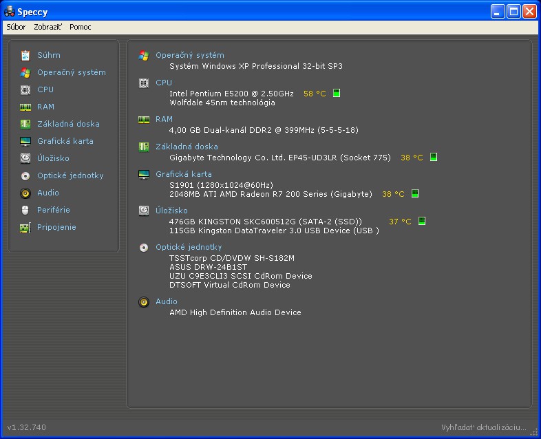 Procesor INTEL / motherboard GIGABYTE / zdroj 520W / RAM 2x2Gb / dva klasické harddisky 1 TB SATA - jen na data / 512 Gb SSD SATA na OS - jsou dva / monitor LCD 19" / OS WIN 7 - legal 32bit a XP legal / dvě DVD mechaniky / jedna disketovka 3,5" / grafika GIGABYTE s 2 Gb / počítám BOINC