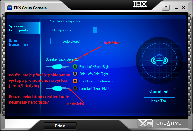 Boužel todle je jádro problému prostě nemůžu přijít jak to tady takle nastavit. Snad nechci tomu věřit že u zvukovky za 3K pujde zapojit jen jedno nebo druhé zařízení to teda pak realtek je svatej. Žádnej Creative ovladač nemá tu možnost prohrabal jsem se v tom aspoň myslim že důkladně.(Teď pokuď chci pustit něco na bedny musim pokaždý za PC vytahnout sluchátka a zapojit bedničky :shock: )