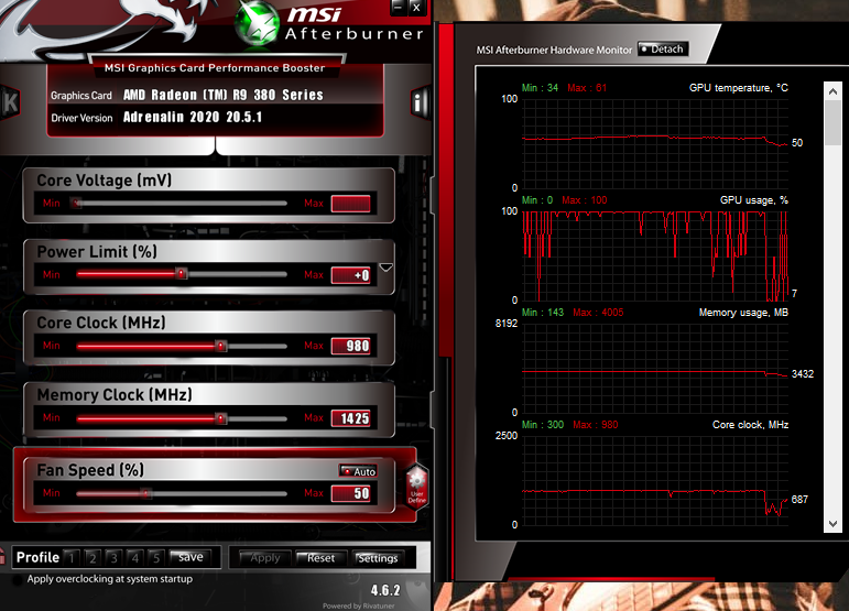 + ještě screen z Afterburneru, který právě sám reguluje ventilátory GK (upřímně, nevím, zda ho mám nastavený úplně ideálně..)