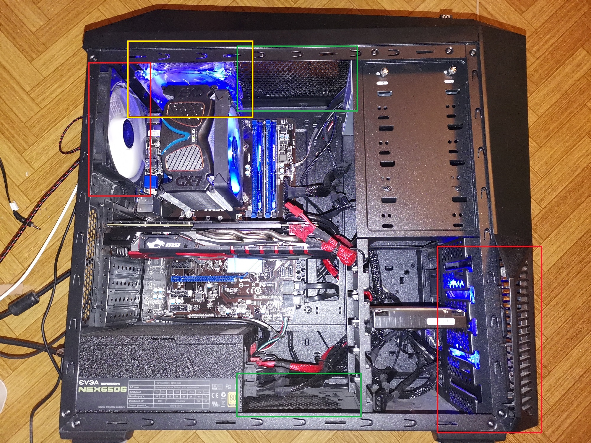 Tu case jsem měl taky doma. První co jsem udělal bylo to,že jsem vyhodil ty malé boční ventilátory. Foukají nesmyslně proti sobě a navíc prakticky zastaví proud vzduchu od předního ventilátoru. Pak se ten studený vzduch nedostane směrem do skříně.