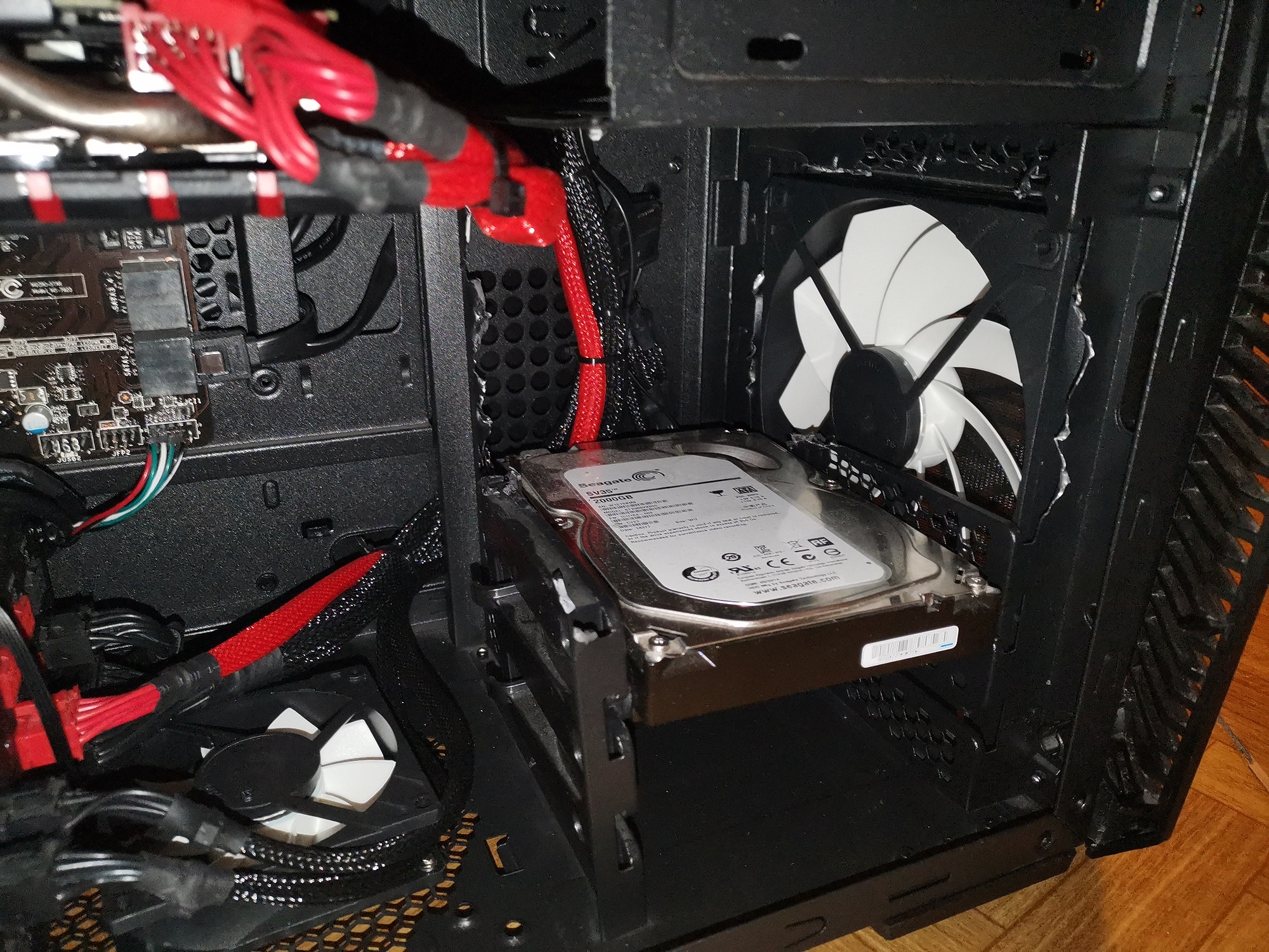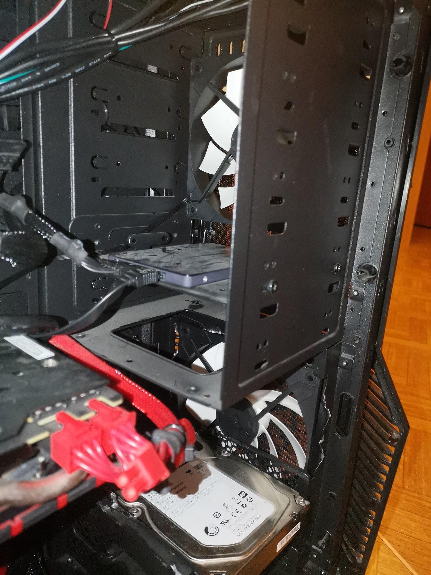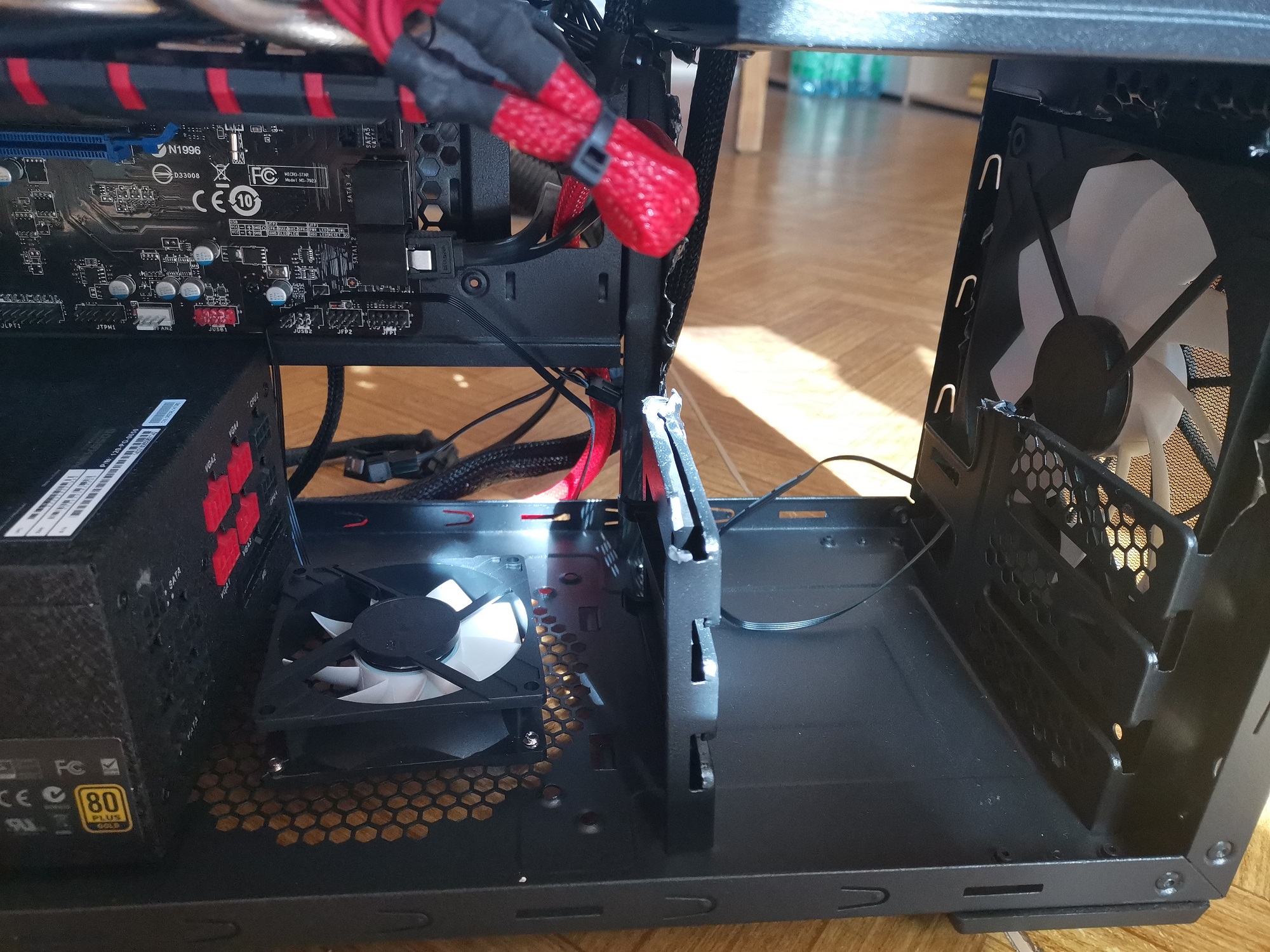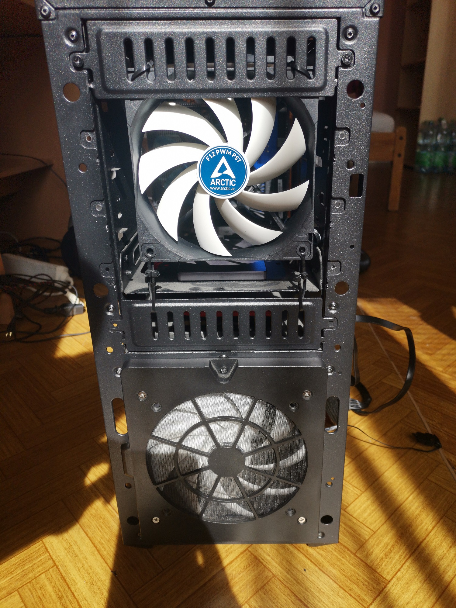 Takže, je po mé dlouhé akci, přebytečné plechy jsou vyštípané, PC je relativně vyfoukáno (jak to šlo), nové ventilátory jsou namontovány. Můžete se podívat sami. K mému milému překvapení se PC zapnulo. :smile: Zda to vše k něčemu bylo, nebo ne, napíšu později, až to ,,otestuji". :smile: Na místo, kde vznikla díra po odendání mechaniky, jsem si vyřezala ze dřeva obdélník, který přesně do mezery sedí, ještě jsem ho přestříkala na černo, aby zapadl. :smile: Akorát nevím, jestli to trochu nebrání přednímu hornímu ventilátoru, každopádně to je ale asi lepší než díra. :smile: