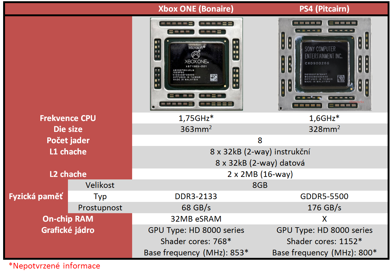 Tento „seriál“ má být o desktopových CPU a jejich sonetech, ale ani zde se neubráním drobné odbočce a to směrem k jednoúhelným zařízením, NextGEN konzolím. Důvod je jednoduchý, Xbox ONE i PS4 využívají procesorová jádra Jaguar, stejně jako platforma AM1. Avšak několik rozdílů zde je, konzole využívají SoC s 8 CPU jádry a GCN grafikou. Takt CPU je u konzolí pohybuje okolo 1,6GHz, podstatný rozdíl mezi oběma konzolemi je v použité iGPU a také v připojených pamětech. SONY využívá o něco silnější grafiku vycházející z jádra Pitcairn (HD 7850/7870 a R9 270(X)) a využívá 8GB GDDR5 pamětí. Microsoft zvolil o něco slabší základ, Bonaire (HD 7790, R7 265) a kombinaci relativně pomalých DDR3 pamětí s rychlými 32MB eSRAM. Obě SoC jsou vyráběny 28nm technologií, poslední dobou se však proslýchá, že AMD připravilo pro XBOX One novou revizi vyráběnou na 20nm výrobním procesu, což by mělo vést k nižším nákladům a možnosti uvést SLIM verzi.