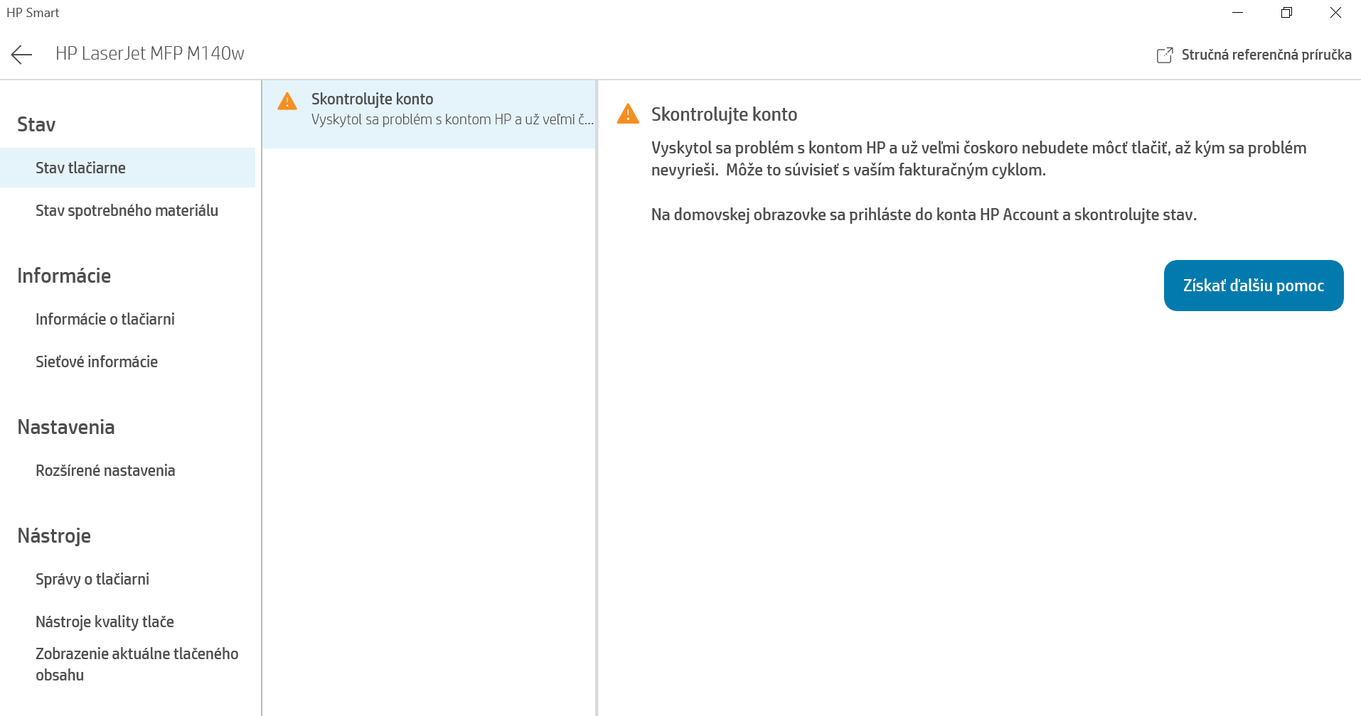 Cez aplikaciu HP Smart som robil diagnostiky, ktore ale ziadny konkretny problem nevykazali, ale tlaciaren mi aj tak stale hlasi, ze treba skontrolovat HP konto.