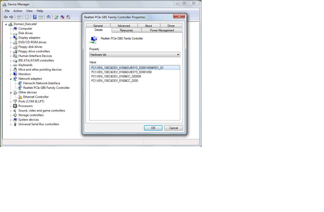 Ve správci zařízení je napsaná Realtek PCIe GBE Family Controller. Tu jsem na netu hledal, zkoušel jsem asi dva ovladače, ale bez výsledku.