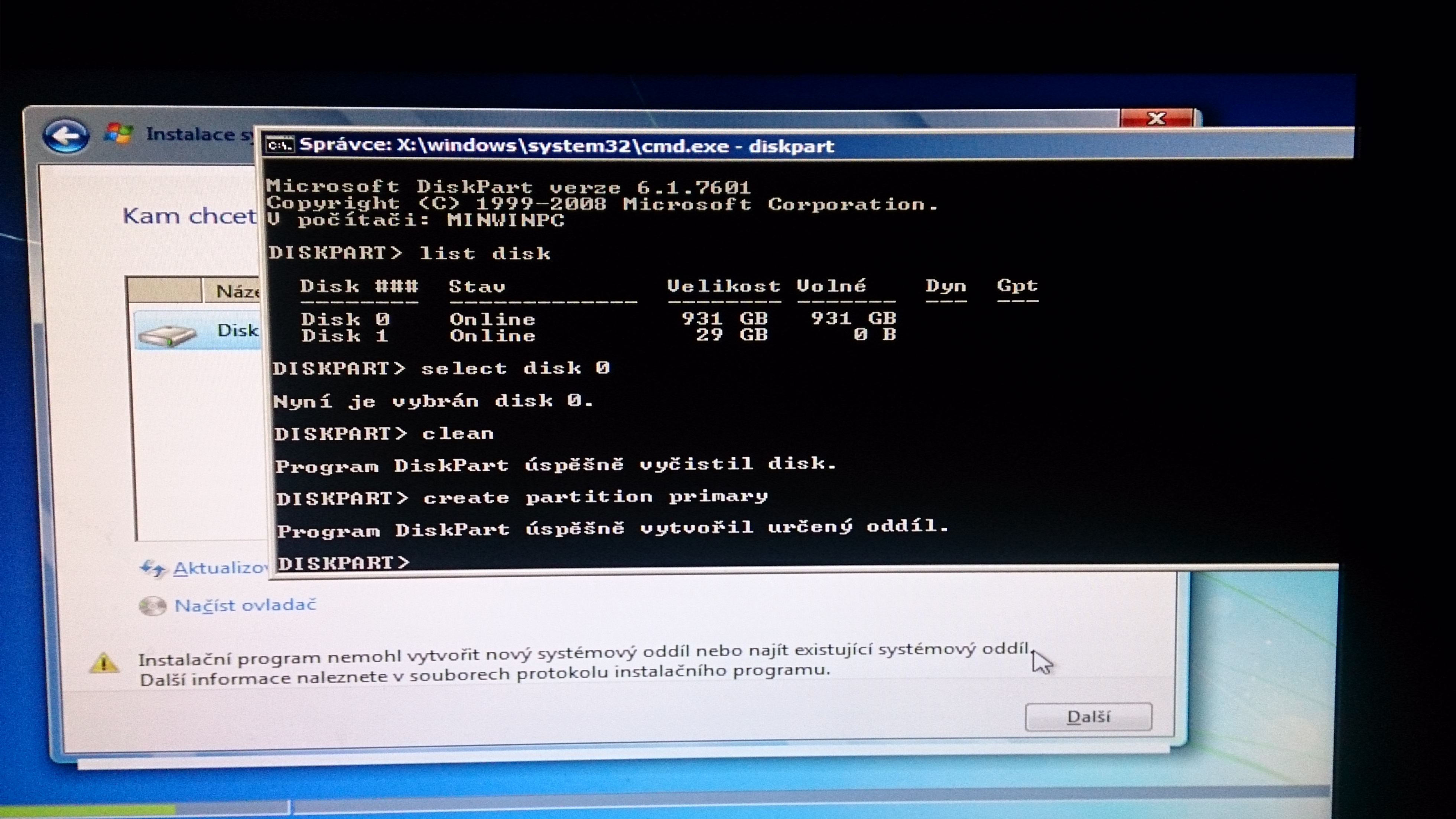 Re: Instalační program nemohl vytvořit nový systémový oddíl.