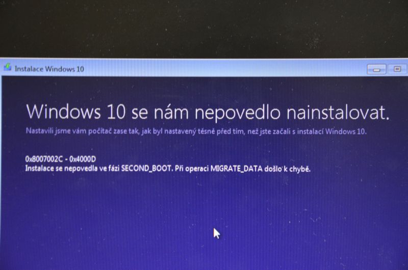 mám problém s upgradem Windows 10 - stáhl jsem si Media Creation Tool a vytvořil jsem si USB s instalací Windows 10. Po instalaci naskočila černá obrazovka a nic se nedělo tak jsem vypl a zapl jsem PC potom zobrazila se tabulka "Vracím PC do původního stavu" nebo něco takového :-( . Zobrazili jse mi znovu Windows 7 a hláška "Windows 10 se nám nepovedlo nainstalovat - kód chyby 0x8007002C - 0x4000D". Nevíte co s tím?