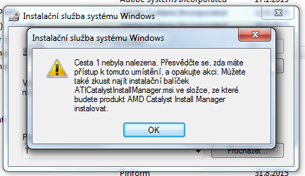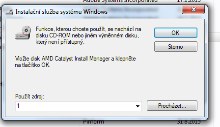 Ahoj, jak už napovídá název, všiml jsem si, že v programech a funkcích mám 2x program AMD Catalyst Install Manager (viz. obrázek). Problém je v tom, že pokud poklikám na upravit/odinstalovat na ten první ovladač (bez obrázku), zobrazí se hláška, že mám vložit instalační disk (viz. obrázek). Pokud vložím disk s ovladačema ke grafice nestane se nic. Pokud dám OK nebo storno napíše to chybu : Cesta 1 nebyla nalezena. Přesvědčte se, zda máze přístup k tomuto umístění, a opakujte akci... Když rozkliknu možnost použít zdroj je tam jen jednička. Zkoušel jsem pomocí funkce procházet najet do stažených souborů kde mám instalačku od těch ovladačů a není možnost tu instalačku vybrat, mám tam jen hamachi.msi. Zkoušel jsem vyčistit registry Ccleanerem, ale bez výsledku. Program se nejspíš objevil 2x po tom co jsem se z Windows 10 vrátil na Windiws 7.