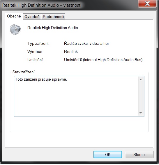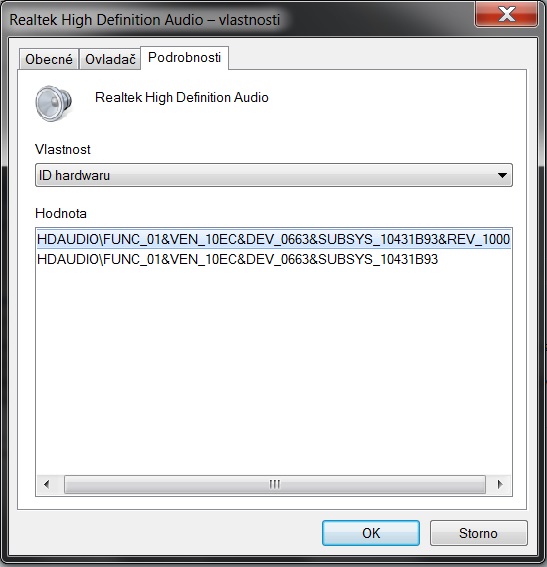 Ve Správci zařízení klikní pravým tl. myši na tu RealTek zvukovku a dej Vlastnosti. Zkopíruj sem Stav zařízení a ze záložky Podrobnosti hodnotu z vlastnosti ID Hardwaru.