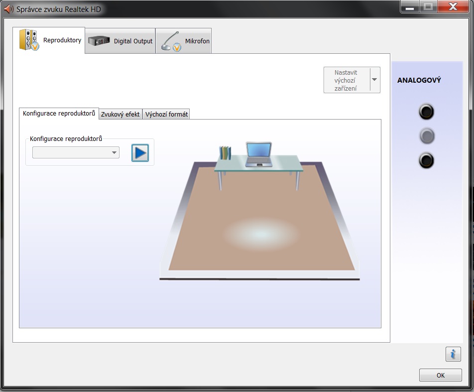 Dál zapni RealTek HD Audio Manager a vlož sem z něj screenshot. Ještě se bude hodit screenshot z Ovl. panelu Zvuk, karta Přehrávání. Klikni do okna výběru zařízení pravým tl. a dej Zobrazit vypnutá a odpojená zařízení.