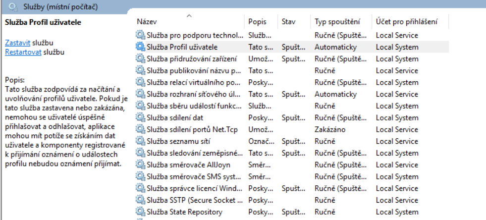 Přihlášení služby Služba Profil uživatele se nepovedla