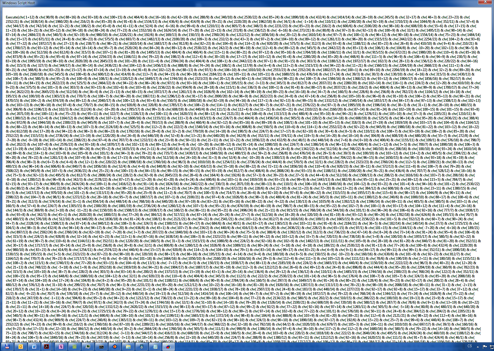 Funkce chr() převádí číslo z ascii kódu na písmeno textu. Výsledný text obsahující vlastní program se snaží spustit metodou "Execute". A zde je kámen úrazu, protože Visual Basic Script metodu "Execute" vůbec nezná - to je důvod, proč to hlásí chybu. Skript byl patrně stvořen pro vyšší verzi - tedy přímo pro Visual Basic, nebo to možná umí i VBA - Visual Basic for Application, který umí např. Excel.