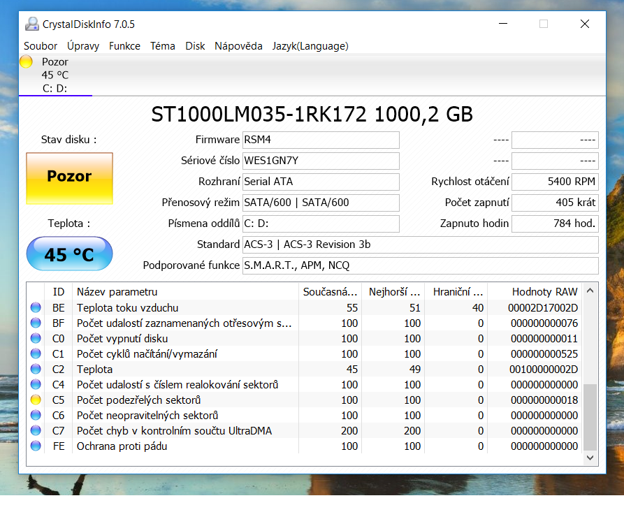 Dle crystal diskinfo je harddisk ve stavu POZOR. Pc mám 5 měsíců a je s ním pořád nějaký problém.