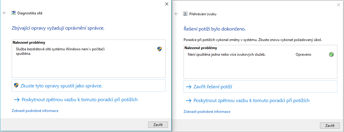 Poté je pravděpodobně nějaký problém s ovladačemi zvuku a wifi adaptéru. Pro funkčnost WiFi adaptéru musím provést jeho diagnostiku, poté se rozběhne, více info v příloze. Pro zvuk stačí spustit "odstranění potíží".