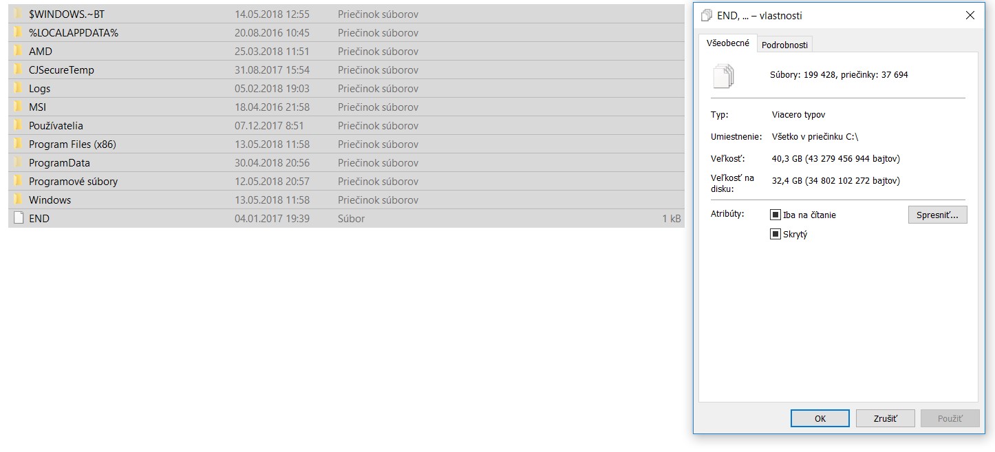 Dobrý deň, narazil som na nasledovný problém. Windows 10 a niekoľko programov mám nainštalovaných na 100 GB SSD disku, ostatné programy, hry, dáta (obrázky, fotky, hudbu, dukumenty...) ukladám na 1TB disk D. Pri poslednej aktualizácii mi Windows ohlásil nedostatok miesta na disku C. V zložke "Tento počítač" to skutočne vyzerá, že je disk plný viz obrázok 1. Keď otvorím disk C a pozriem vlastnosti všetkých zložiek, vrátane skrytých majú dokopy 40.3 GB viz obrázok 2. Kde strácam skoro 60 GB miesta? Prosím o radu. Ďakujem.