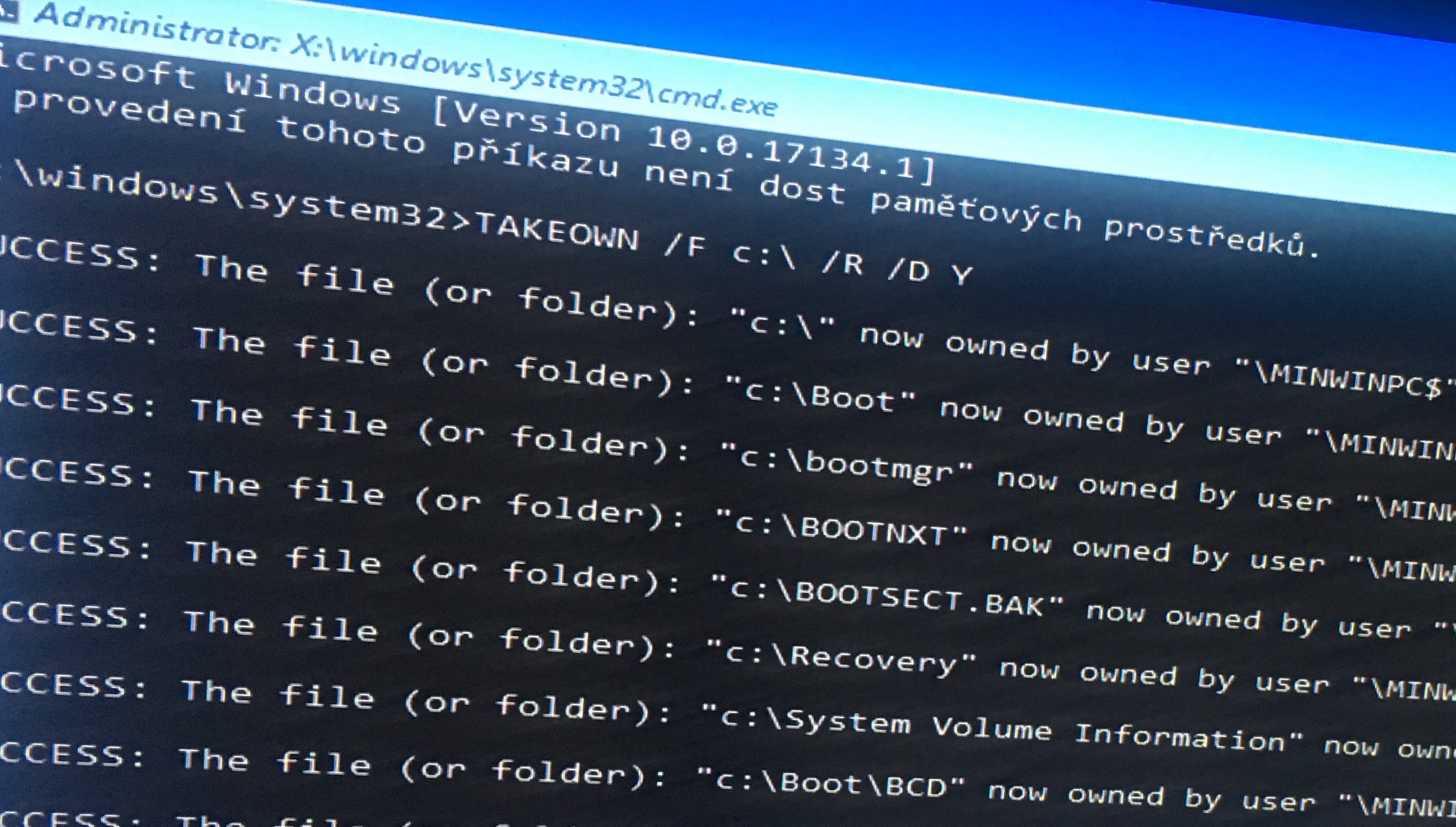 Dnes budu mít instalační recovery disk a mělo by to jít opravit. Jinak jsem zkoušel v prikazivem řádku přes shift+restart prikaz TAKEOWN ale automaticky to bere uživatele který tam není. Lze do příkazu doplnit můj účet ?