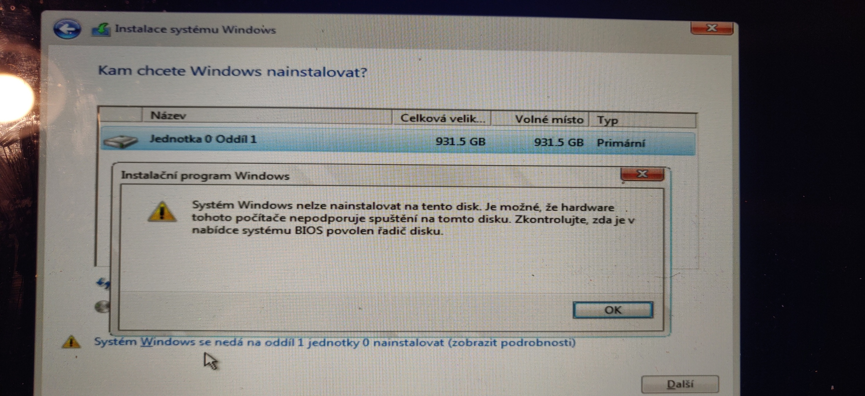 Tak jsem se posunul, musel jsem změnit formát disku na GPT přes příkazový řádek ale poté se zobrazí zase další problém