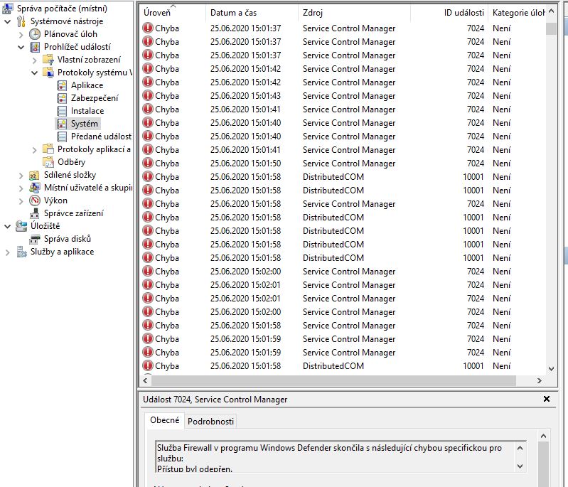 Služba Firewall v programu Windows Defender skončila s následující chybou specifickou pro službu:
