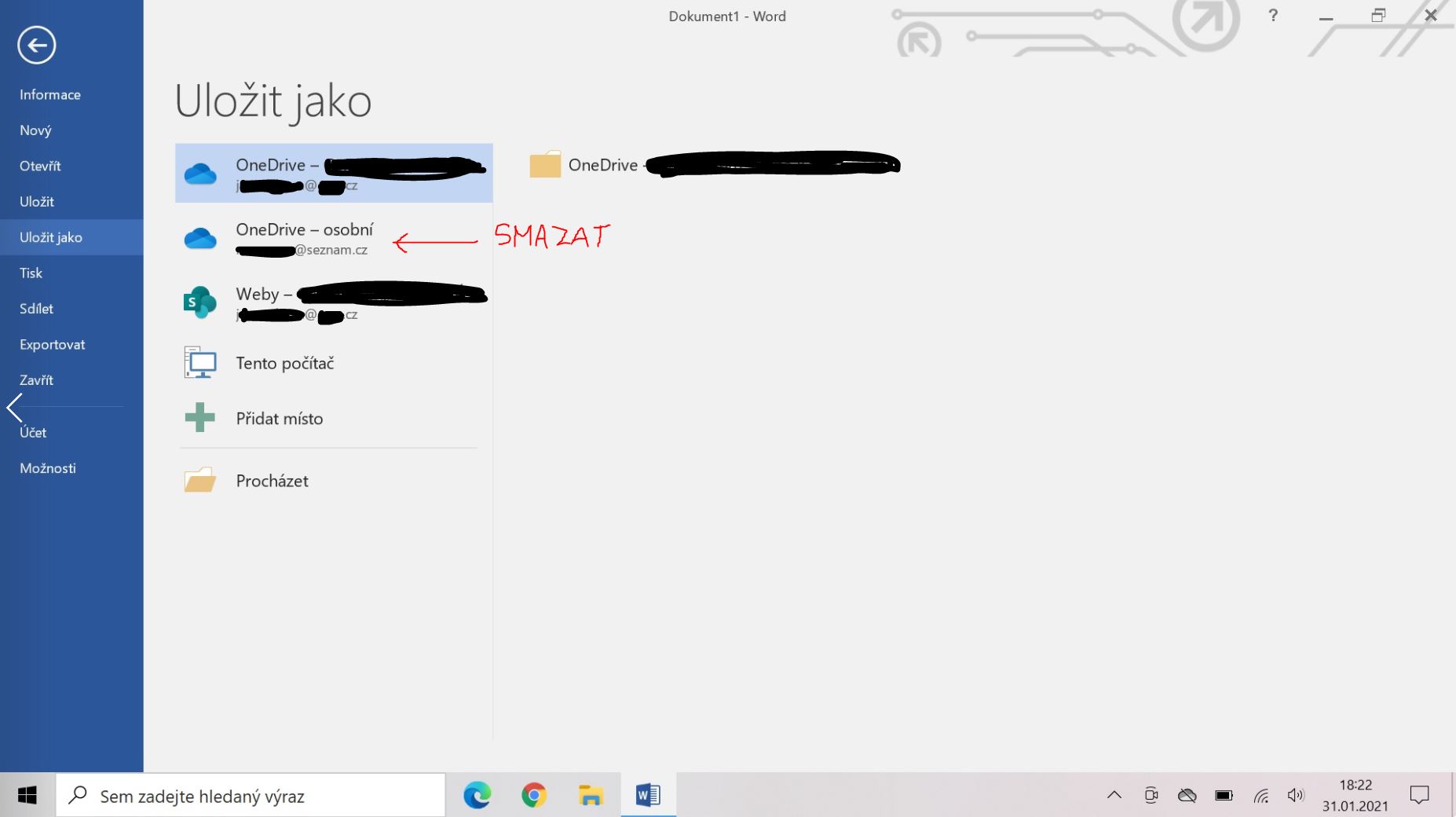 přinesl jsem si domu z práce služební počítač a nějakým omylem jsem si do něj zadal svůj soukromý účet (ze svého soukromého počítače). Bohužel se mi tento soukromý účet nedaří ze služebního notebooku odstranit. V příloze najdete, kde všude se mi tento soukromý účet (končící na "@seznam.cz") objevuje - v "Email a účty" v Nastavení, v Nastavení jako "Můj účet Microsoft" a v MS Office ve OneDrive.