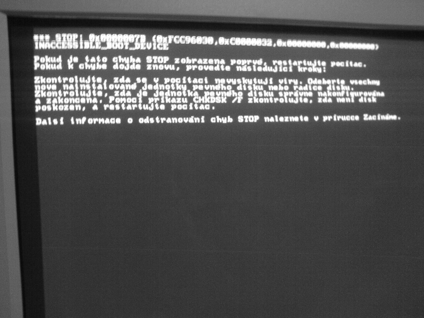 Patří k "nejméně příjemným" chybám jelikož se kvůli ní většinou nejde již vůbec dostat do Windows ani v nouzovém režimu a pomůže jen přeinstalace. Touto chybovou hláškou nám systém oznamuje, že po zavedení jádra nemůže přistoupit k zařízení, na kterém jsou uloženy systémové soubory. Většinou se jedná o situaci, kdy v počítači vyměníme RAID nebo SCSI řadič na jiný typ nebo použijeme novou desku s odlišnou čipovou sadou. Pokud tato chyba nastane během instalace, pravděpodobně jsme zapomněli nainstalovat ovladač pro řadič disku.Pro úplnost ještě uvedu seznam dalšich možných příčin vzniku chyby: vir v boot sektoru, konflikt IRQ nebo I/O zařízení, poškození souborového systému, poškození registru Windows.