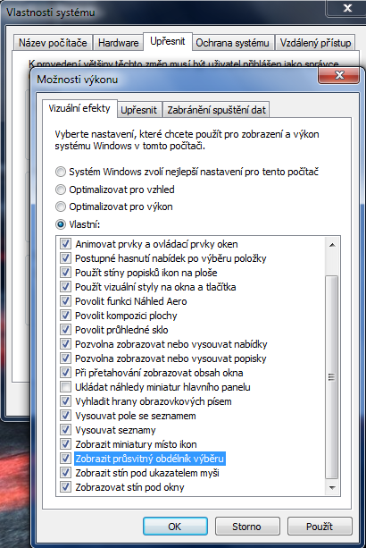 jediný co jsem našel bylo už předtím "Během přetahování zobrazovat obsah okna" a nic se nestalo, bylo to v nastavení vzhledu - efekty... nevím přesně jestli chápu co tím myslíš, nevim jak se k tomu dostat co jsi napsal. Když chci prostě přetáhnout třeba na ploše víc věcí tak to okno je jen ohraničený takovou šedivou tečkovanou čárou...přitom na jiným účtu uživatelským to přetahuje normálně modře...