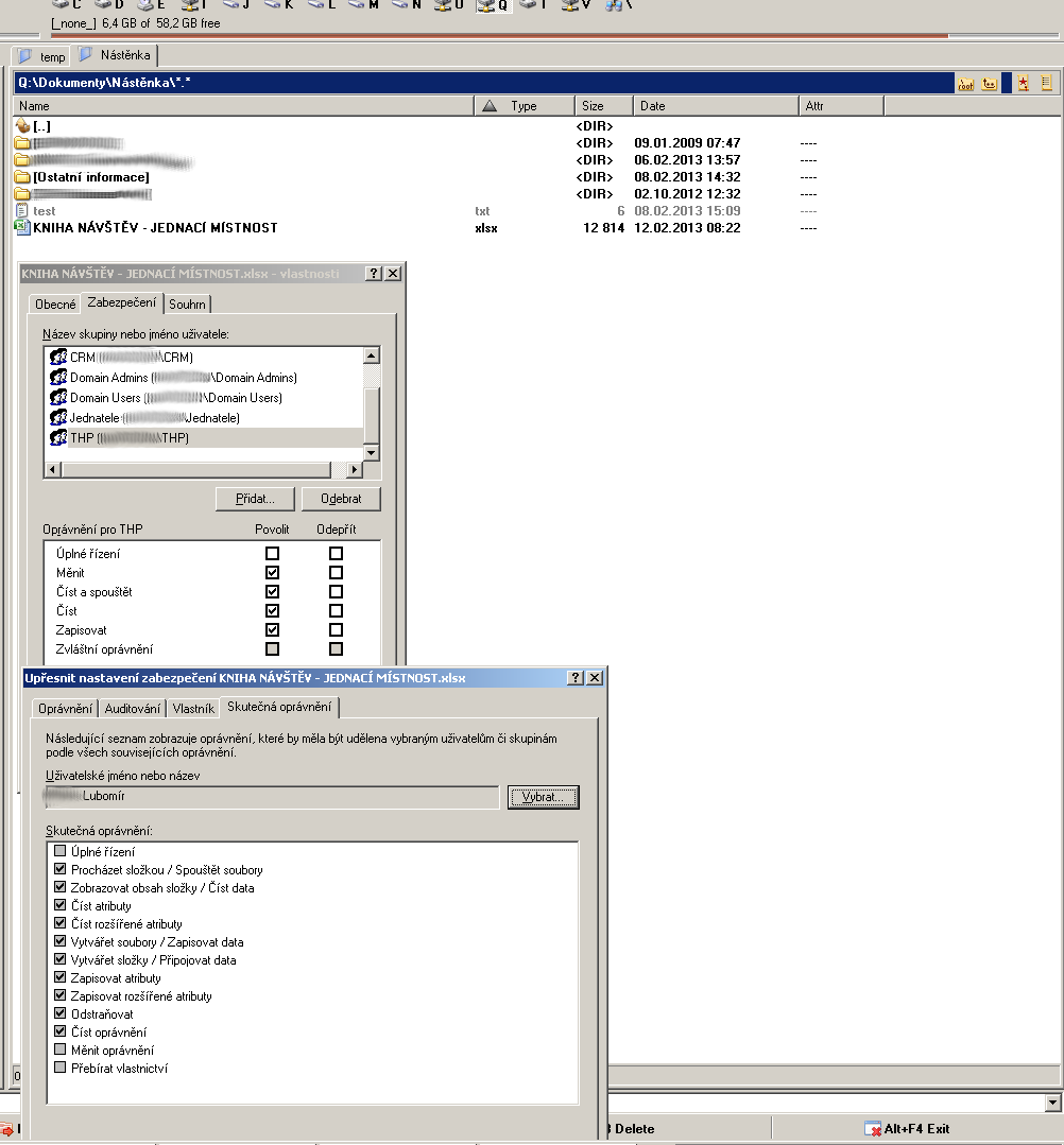 Uživatele Lubomír jsem v Active Directory umístil do skupiny "THP" a skupině "THP" jsem pro daný soubor dal práva Měnit, Zapisovat... zkrátka všechna kromě Úplného řízení. Takže očekávám, že Lubomír bude mít možnost do něj zapisovat. Ale pro jistotu si to ověříme: přes tlačítko "Upřesnit", záložka "Skutečná oprávnění", vyberu doménového uživatele Lubomír a ve výpisu skutečných oprávnění vidím fajfku u všech kromě tří: Úplné řízení, Měnit oprávnění a Přebírat vlastnictví (ty Lubomír opravdu nepotřebuje). Viz screenshot.