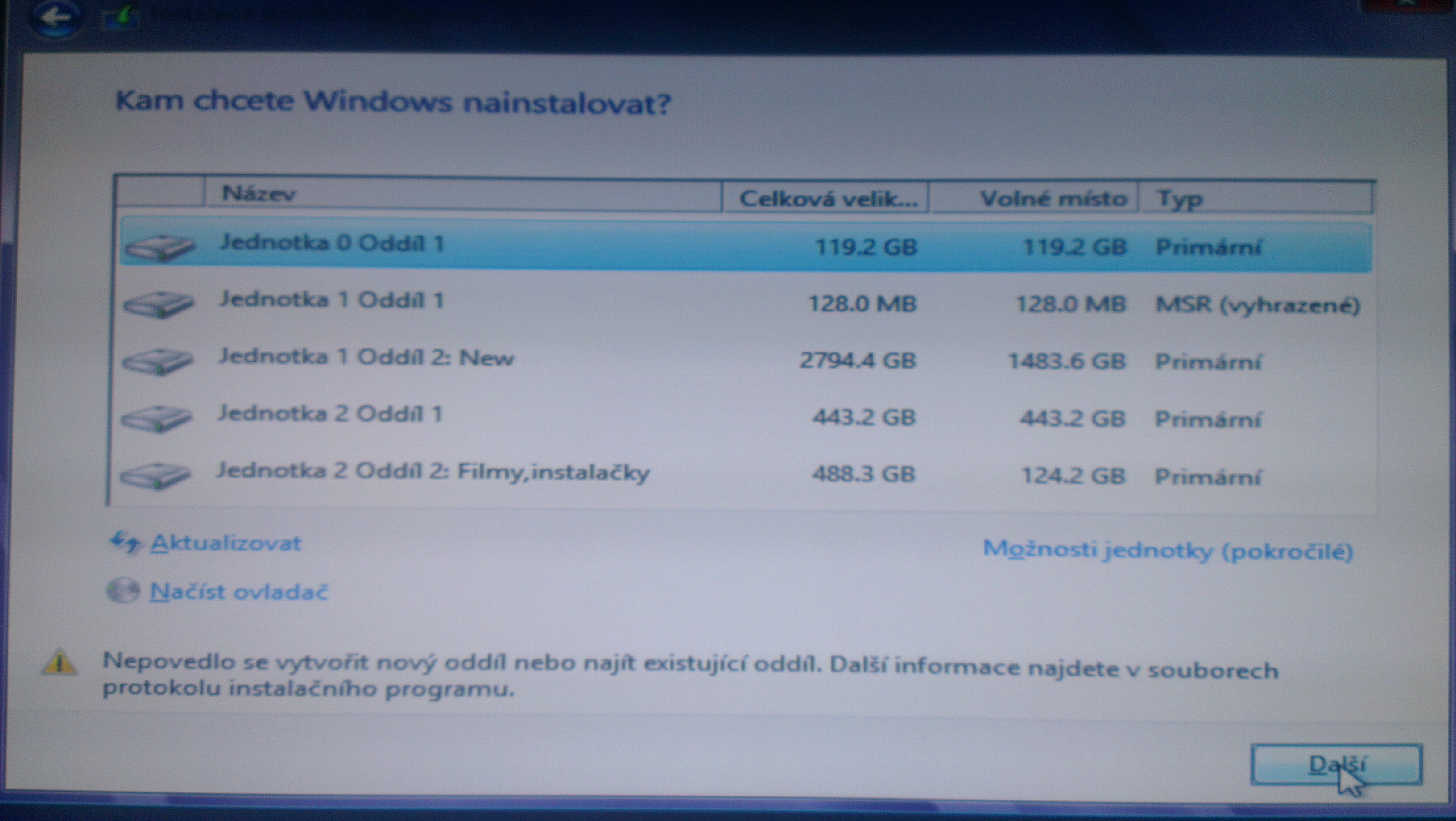 Co to udela kdyz ten oddil na disku 0 smazes (nevytvoris zadny), restartujes pocitac a zacnes instalaci znova?