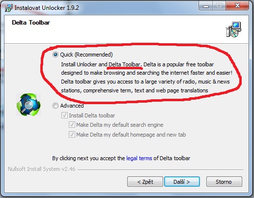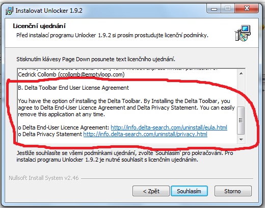 Umíš číst ? to že si nainstaluješ nějaký bordel při instalaci je tvůj problém. 1) Jsi souhlasil s podmínkami Delta Toolbaru, 2) tady jsi měl přímo napsáno že nainstaluje Unlocker a Delta Toolbar + ti nastaví domovskou stránku atd... Stačilo kliknout na Advanced a zrušit výběr Install Delta toolbar.bylo by lepší napsat jakej protože jsem stáhl http://www.stahuj.centrum.cz/utility_a_ ... /unlocker/ a totálně mně to zasralo chrome + to nic nevyřešilo. Okamžitě jsem to odinstaloval ale je pozdě, nějak se teď budu muset prát s websearch bordelem co při instalaci atakoval chrome