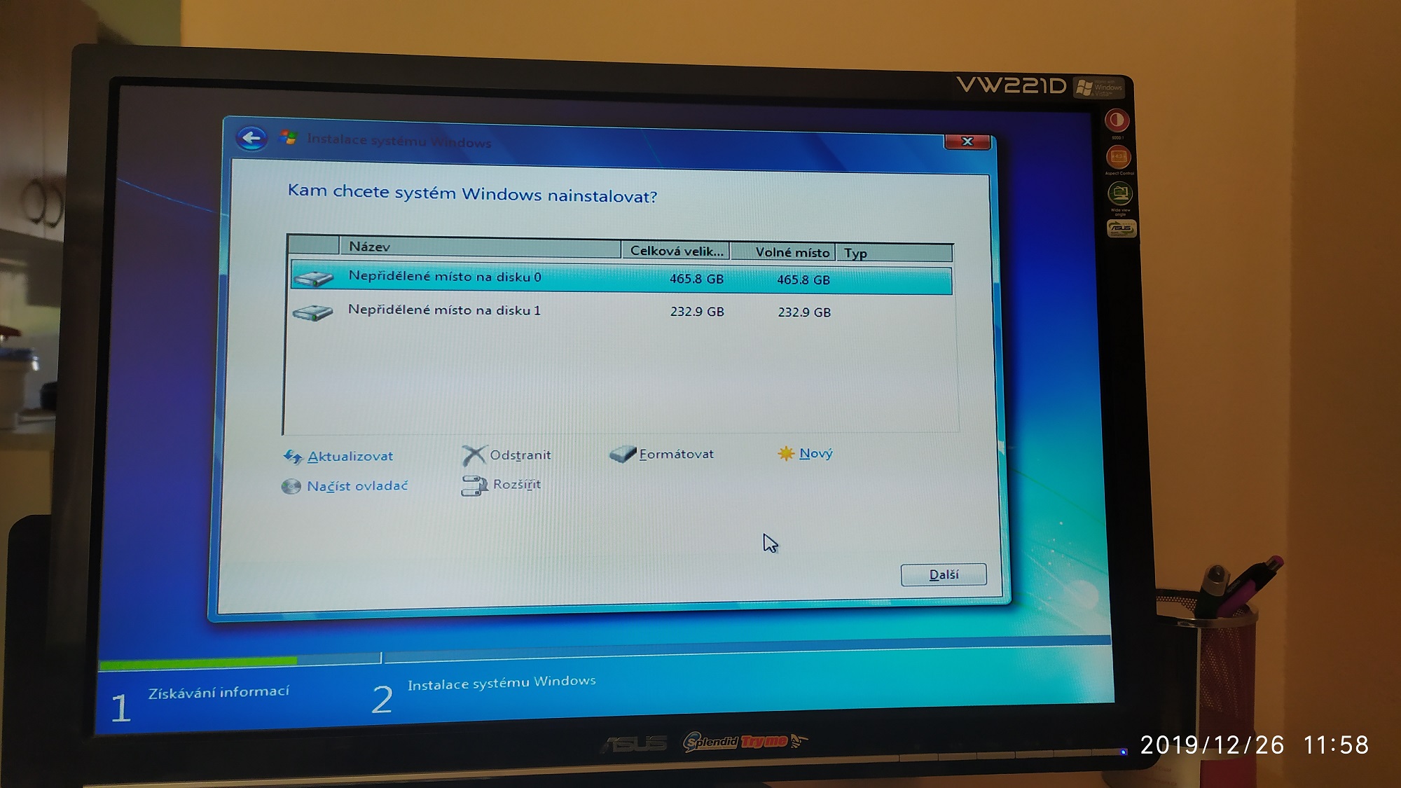 jo takhle už je smazán ... vytvořit nový(plnou kapacitu co nabídne), na který chceš instalovat a instalovat... sysatém si vytvoří bootloader ... ... druhý uděláš i ve správě disků