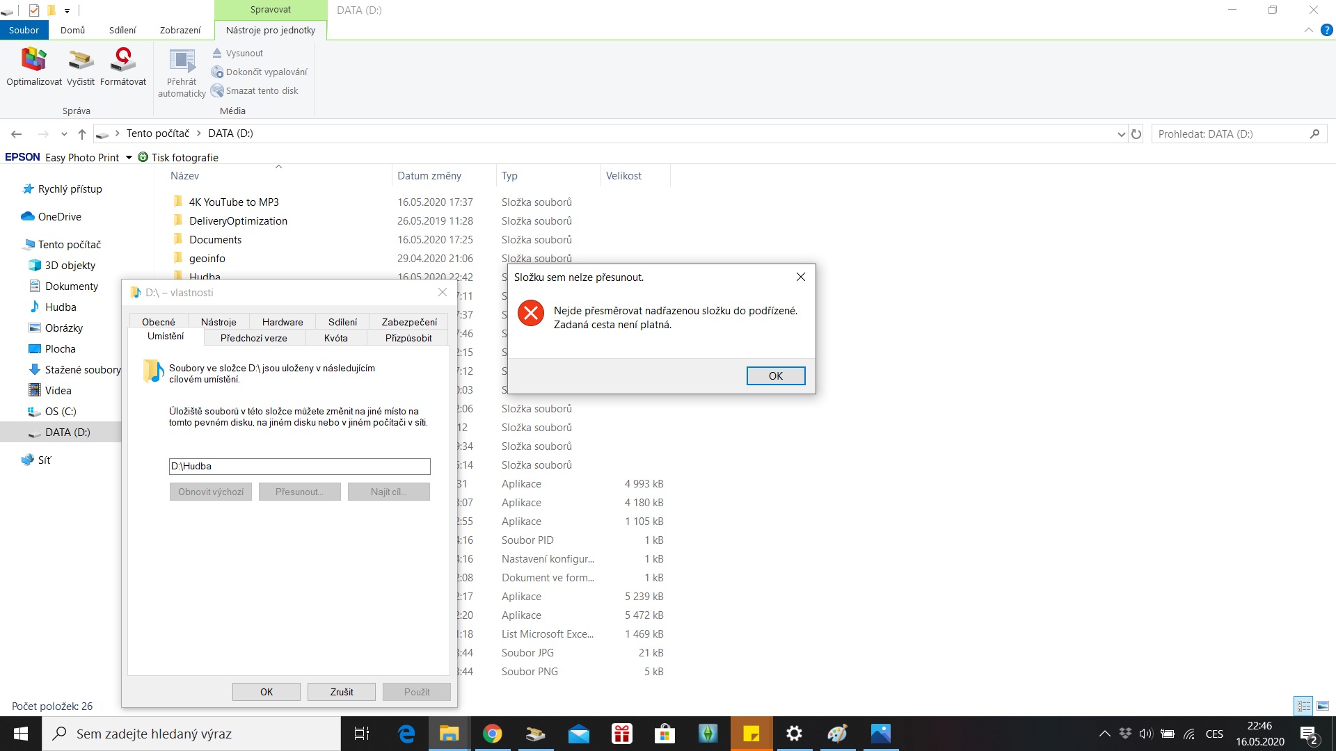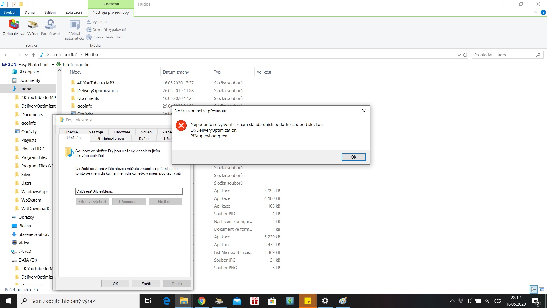 Skús si na D vytvoriť zložku HUDBA.Potom kliknúť PTM na disk D...umiestnenie a vyber si možnosť Premiestniť a ukáž na tú zložku.