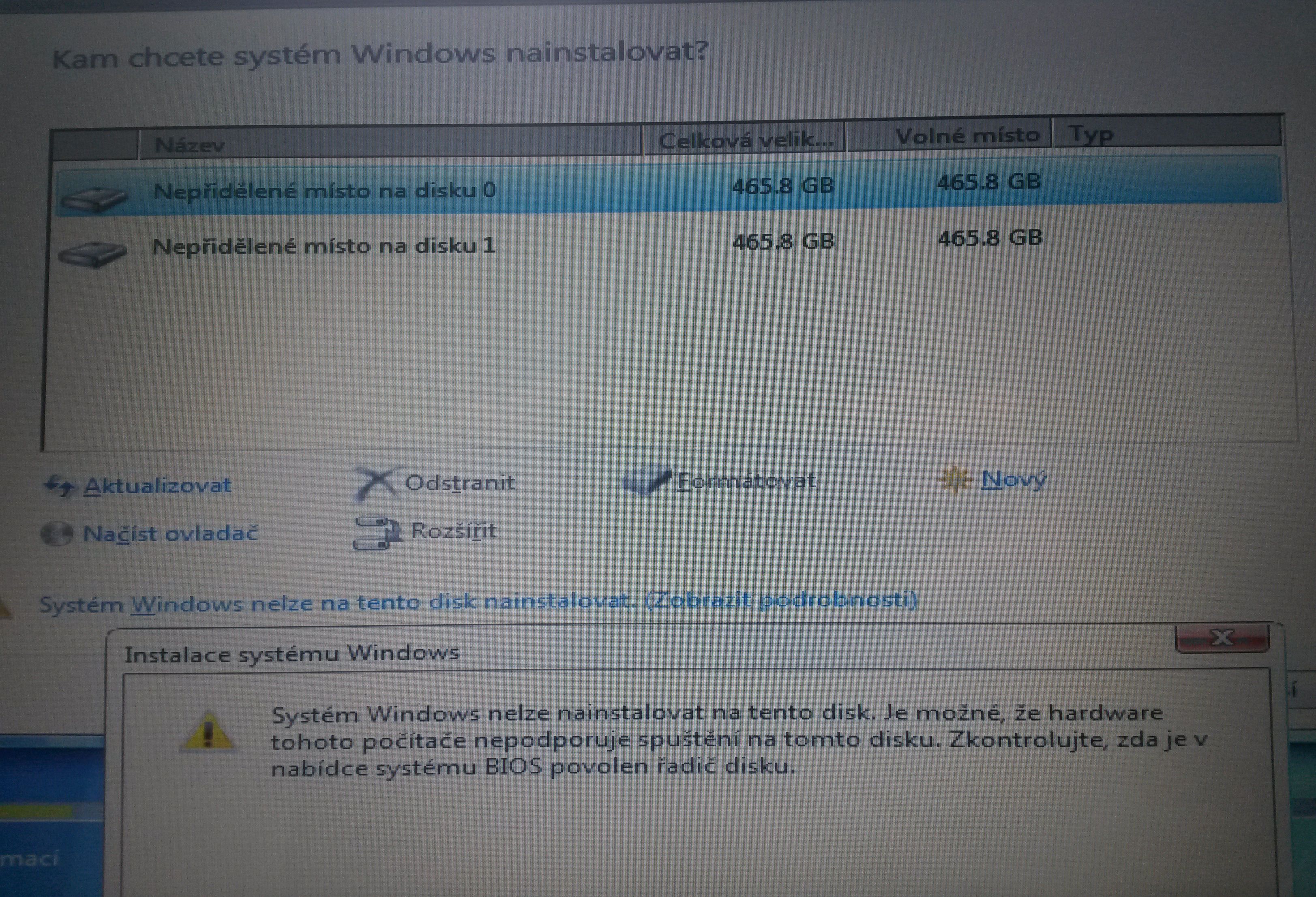 Aktuálně tam mám 2 oddíly 450GB, na žádný z nich nejde nic instalovat