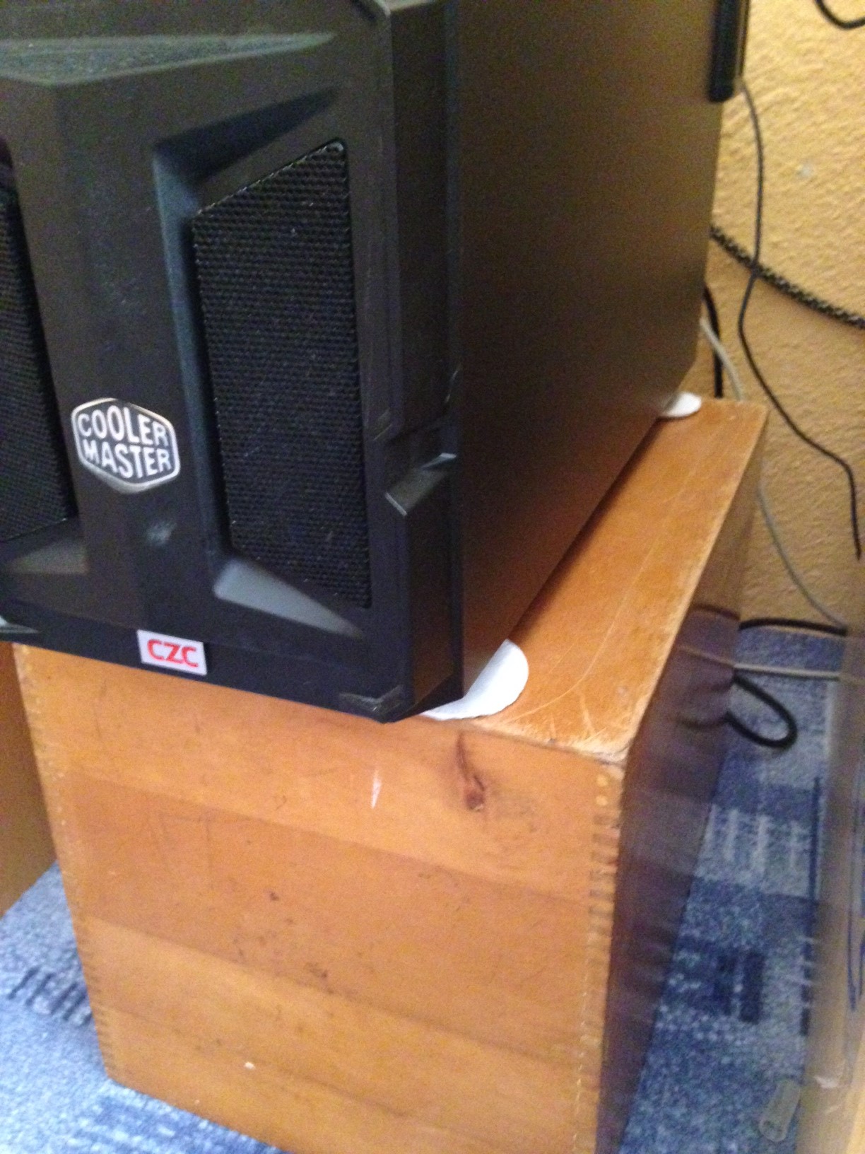 pc mi stojí na této bedně a podložil jsem ho vatovými tampony (viz foto)... nechci ho cpát na koberec (už jenom kvůli spodnímu větráku zdroje)... co by jsi poradil jako ideální podložku mezi bednou a nožkami skříně? teď to celkem hučí a když PC zvednu je slyšet rozdíl