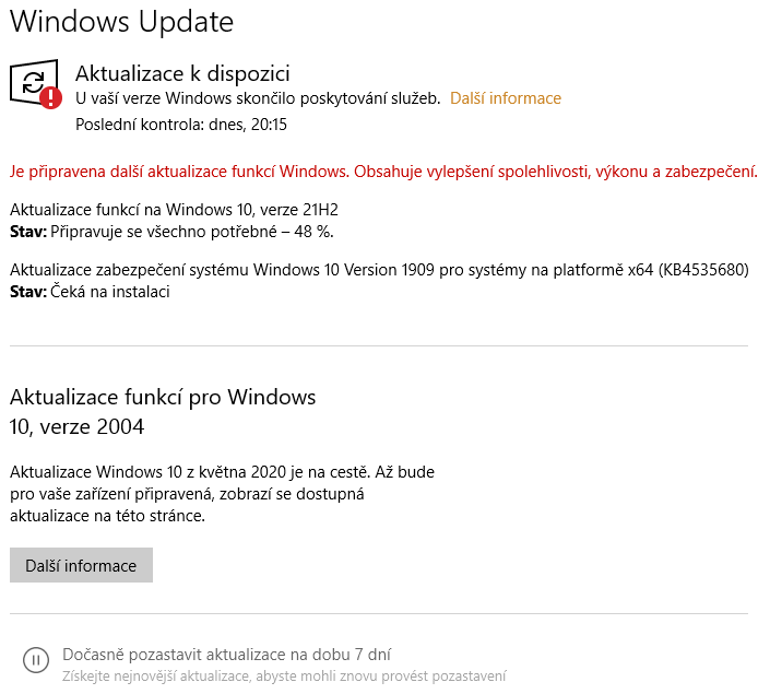 Zastavilo se to na buildu 1903 18362.1256. Zatím nevím jak, ale odpoledne budu pokračovat...