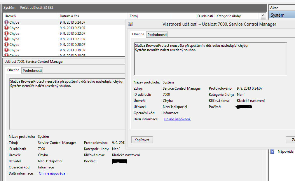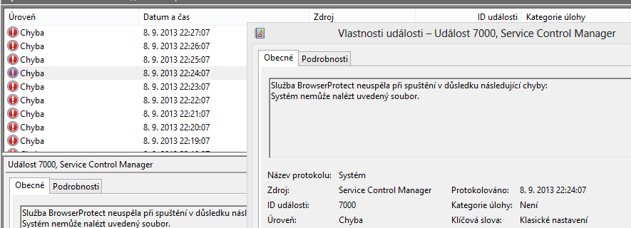 Ten soubor který nebyl nalezen, je soubor, ve kterém je implementována ta služba browser protect. Služba má stále svůj záznam v registru a proto se ji snaží správce služeb spustit.