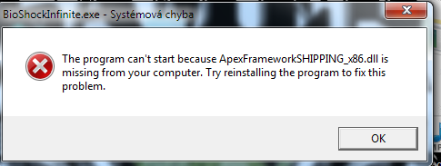 ApexFrameworkSHIPPING_x86.dll myslím... a ten súbor mám a mám aj bioshoc na ploche keď dám na plochu ten súbor tak už nepíše error ale hra sa nespustí :(