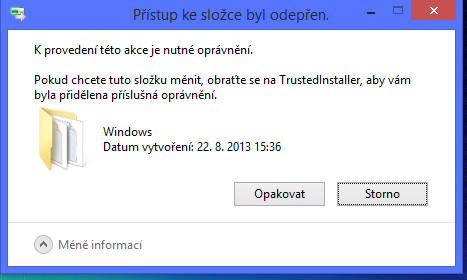 Zkoušel jsem odstranit tu složku Windows jenže nastala chyba: