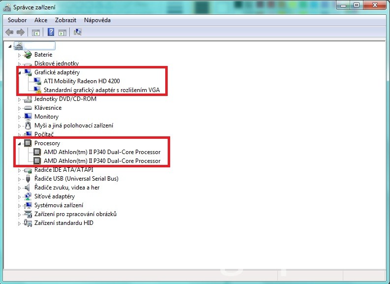 Zde screen ze správce zařízení. Zajímají mě položky "Grafické adaptéry" a "Procesory".