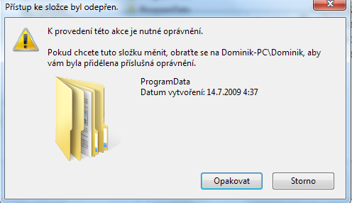 Ahoj,chci odstranit jednu složku na místním disku, "ProgrammData" jsou v ní všechny mé programy i ty co jsem odinstaloval,ale mám je i nainstalované v Program Files a proto jí chci odstranit , když se jí pokusim odstranit tak mi vyjede hláška "k provedení této akce je nutné oprávnění" přitom jsem admin PC,budu rád za každou radu jak to odstranit, je to windows 7 home premium 32 bit.