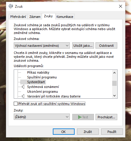 A nemáš tam ani "Přehrát zvuk při spuštění sys. Windows"?