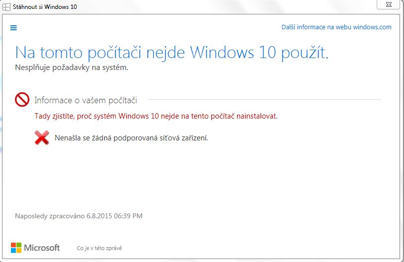 chtěl jsem si uprgadovat na Windows 10, ale napsalo mi to: "Nenašla se žádná podporovaná síťová zařízení". (Viz. screen dole)