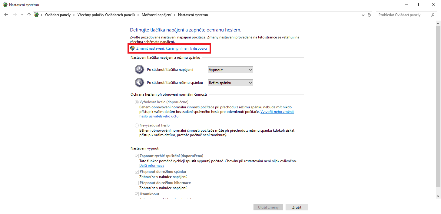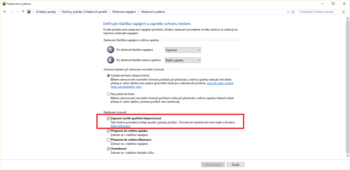 K prvnímu kroku. Běž do nastavení napájení a odškrtni možnost rychlé spuštění. Pokud bude tato možnost šedá (nedostupná), klikni nahoře na Změnit nastavení, které není k dispozici. Viz obrázky.