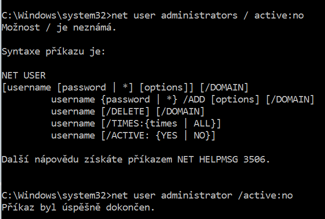 nemáš to správně... máš tam napsat: net user administrator /active:no