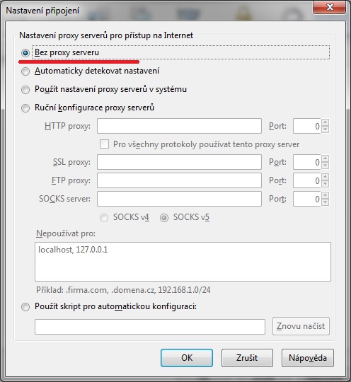 Zkontroluj nastavení proxy v systému. V domácím PC je proxy zbytečná.