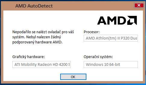 Po naběhnutí systému mi to hlásí chybějící ovladače grafické karty. Zkusil jsem tedy stáhnout AMD AutoDetect, který ale po spuštění hlásí, že nebyl nalezen žádný podporovaný hardware AMD.