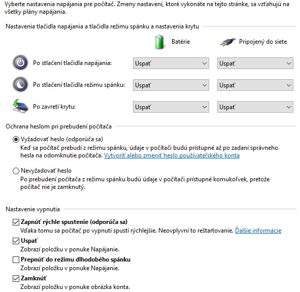 Možnosti napájania - Vybrať akcie pre tlačidla napájania - Zmeniť momentálne nedostupne nastavenia
