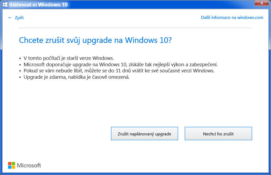 Tam jsem kliknul na "Zrušit naplánovaný upgrade" a nyní doufám, že se mi to snad zastavilo a zrušilo a Windows si budu moct upgradovat na verzi 10 až budu chtít já a ne kdy mi to vnutí Microsoft.