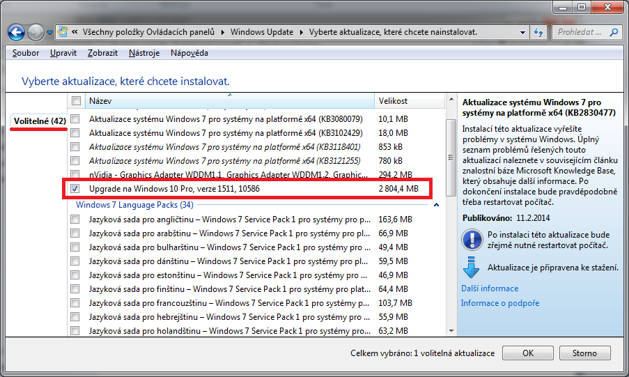 Za poslední dobu jsem se však setkal s tím, že uživatelé hlásí že se jim Win10 nainstalovaly samy. Nevěřil jsem až do té doby, než jsem zjistil, že i na mém PC odinstalovaná a skrytá aktualizace KB3035583 už zase žije, a co víc, win10 je připravena k instalaci! A navíc je zatržena ve volitelných!